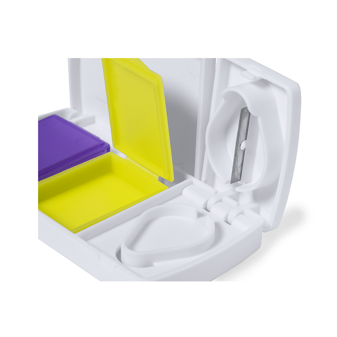 Cutie pentru pastile din material moale și rezistent, de culoare albă. Cu 2 cutii interioare, sistem de blocare de siguranță și lamă pentru a tăia pastile.