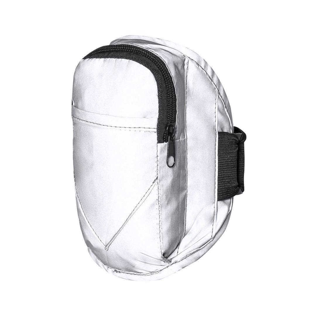 Brățară sport din poliester 210T. Fabricată dintr-un material extrem de reflectorizant, bazat pe principiul retro-reflecției luminii, o proprietate a vizibilității nocturne care constă în refracția luminii înapoi către sursa sa de origine. Buzunar principal cu fermoar și buzunar frontal cu închidere velcro. Cu curea elastică ajustabilă și rezistentă la apă.