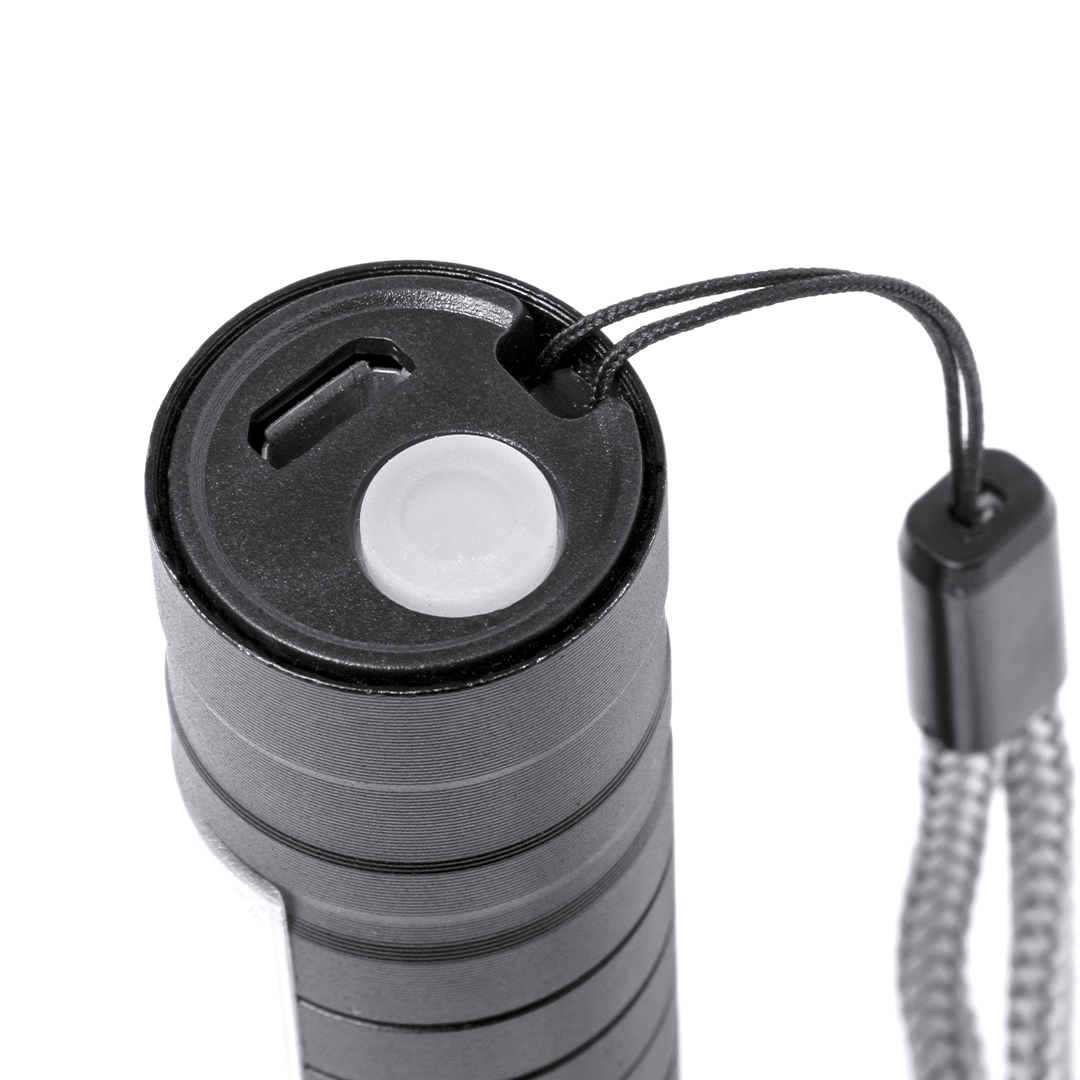 Lanternă puternică cu baterie reîncărcabilă, fabricată din aluminiu cu finisaj negru. Lumină frontală cu 1 LED și cap ajustabil, pentru lumină punctiformă sau difuză. Include 10 lumini COB în mâner și trei moduri de iluminare (constant și două viteze de flash). Alimentată de o baterie reîncărcabilă de 400 mAh, inclusiv cablu micro USB. Prezentată individual într-o cutie de design.