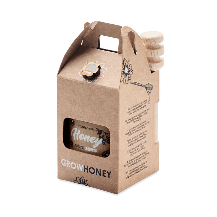 Borcan de miere de flori sălbatice (50g) cu o linguriță din lemn pentru miere. Vine într-o cutie din hârtie kraft. Include semințe de flori pentru albine. Fabricat în UE. Nu este disponibil pentru vânzare în Marea Britanie.