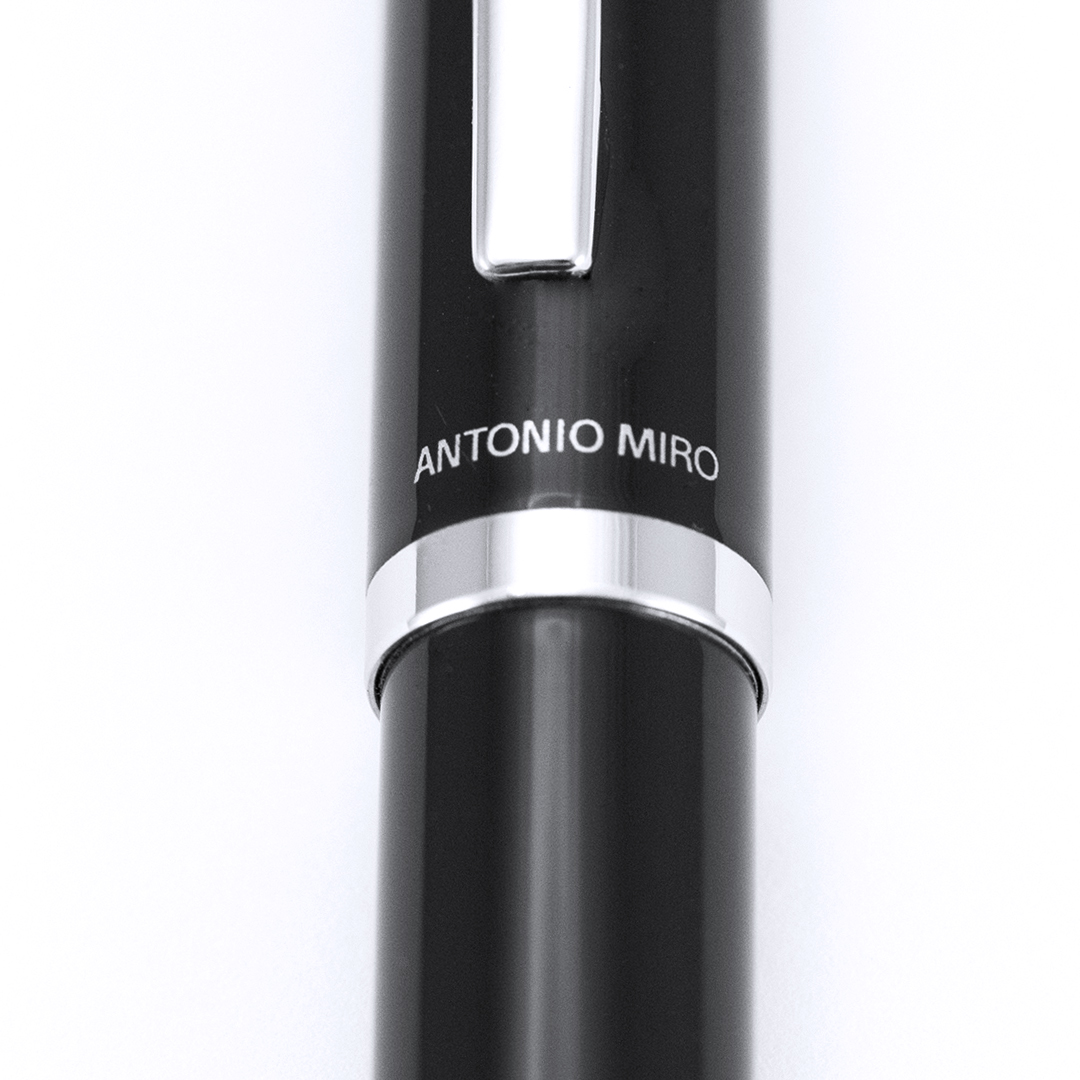 Pix cu bilă de la Antonio Miró, într-un design elegant bicolor și un corp metalic moale în negru sobru. Cu logo-ul brandului pe partea superioară a inelului, clip și vârf cu finisaj argintiu strălucitor. Prezentat într-o cutie individuală neagră cu logo-ul brandului. Cartuș jumbo cu cerneală albastră.