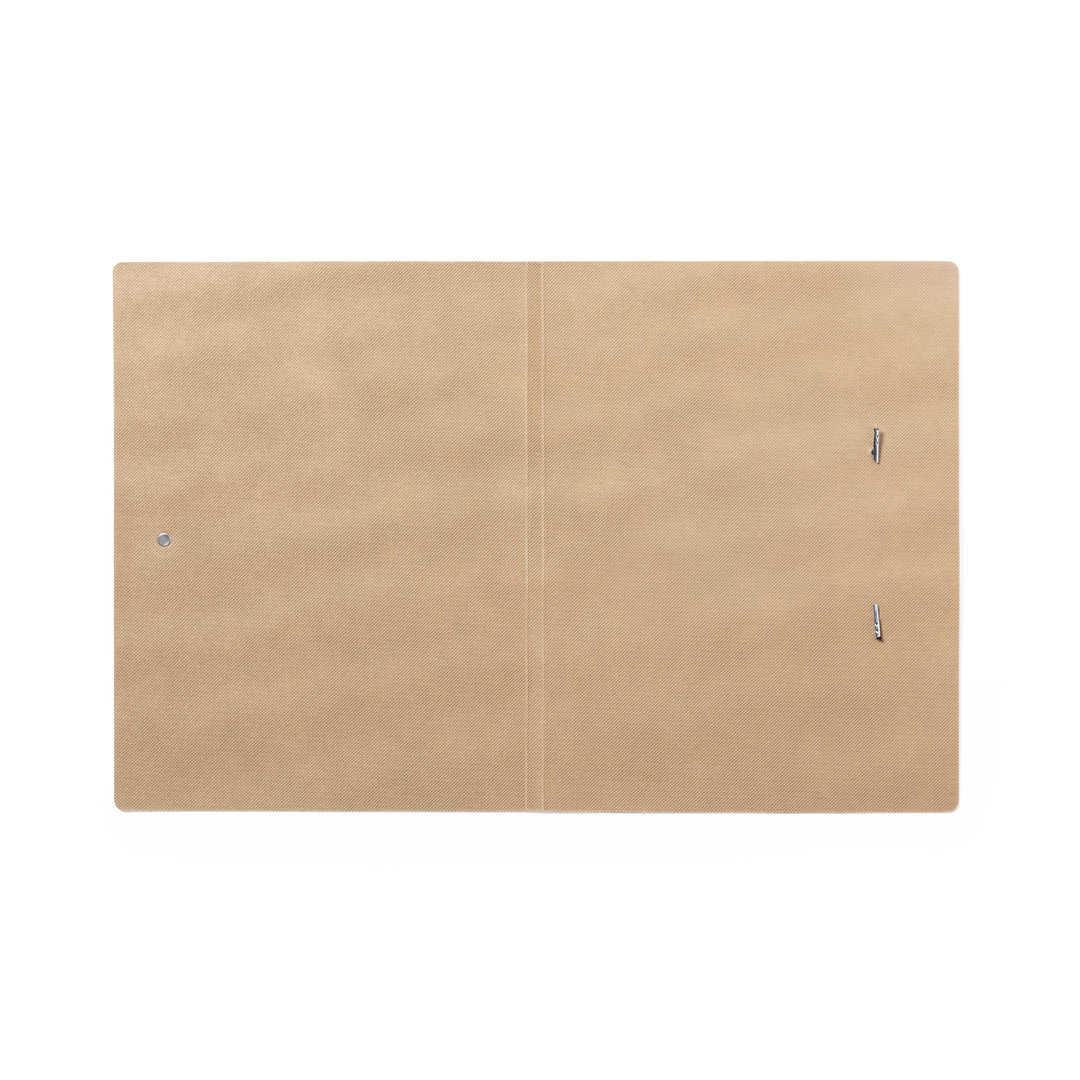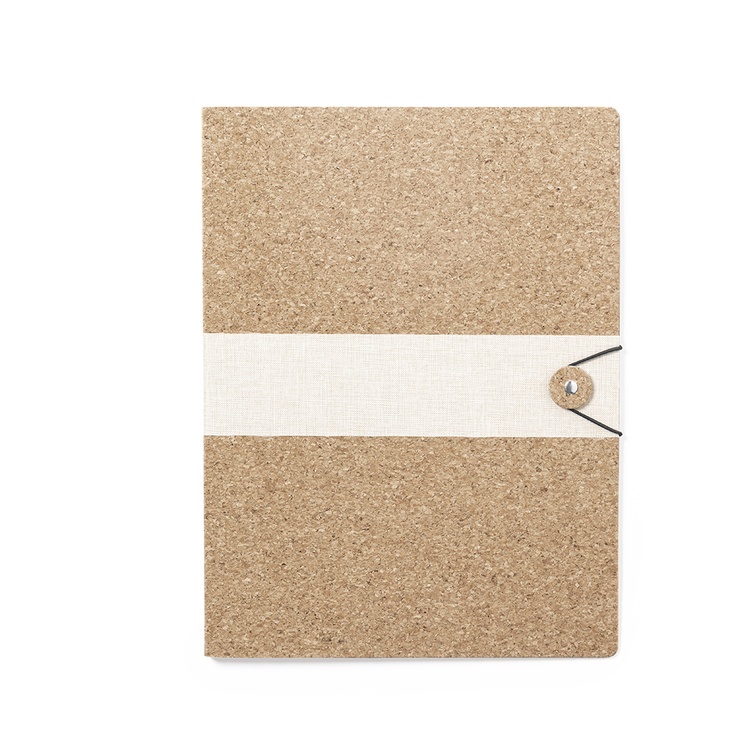 Folderul Nature line cu plută naturală la exterior și bandă centrală din in cu finisaj natural. Închidere cu bandă elastică.