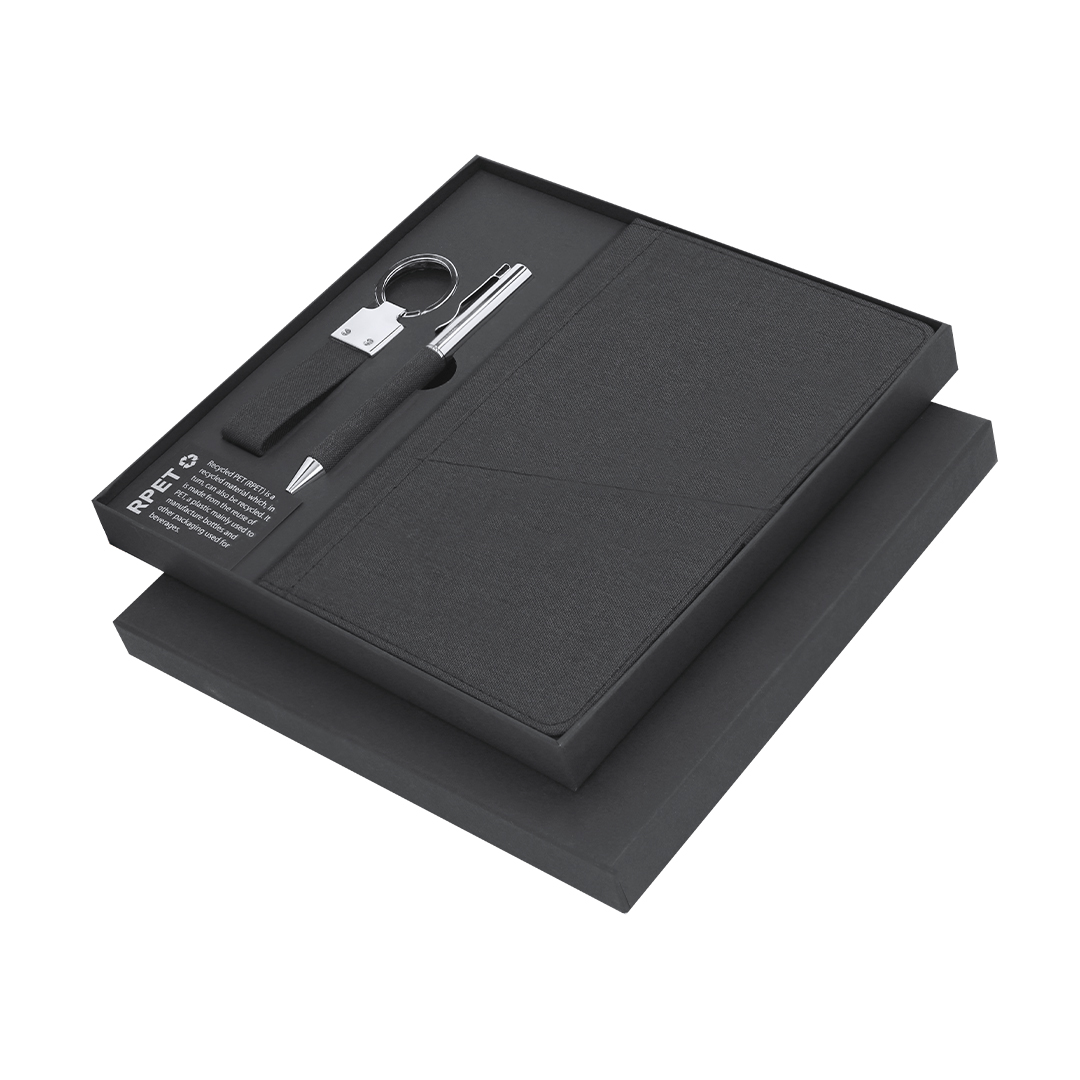 Set prezentat într-o cutie individuală cu finisaj mat, cu interior decupat pentru fiecare element al setului și card RPET în interior.