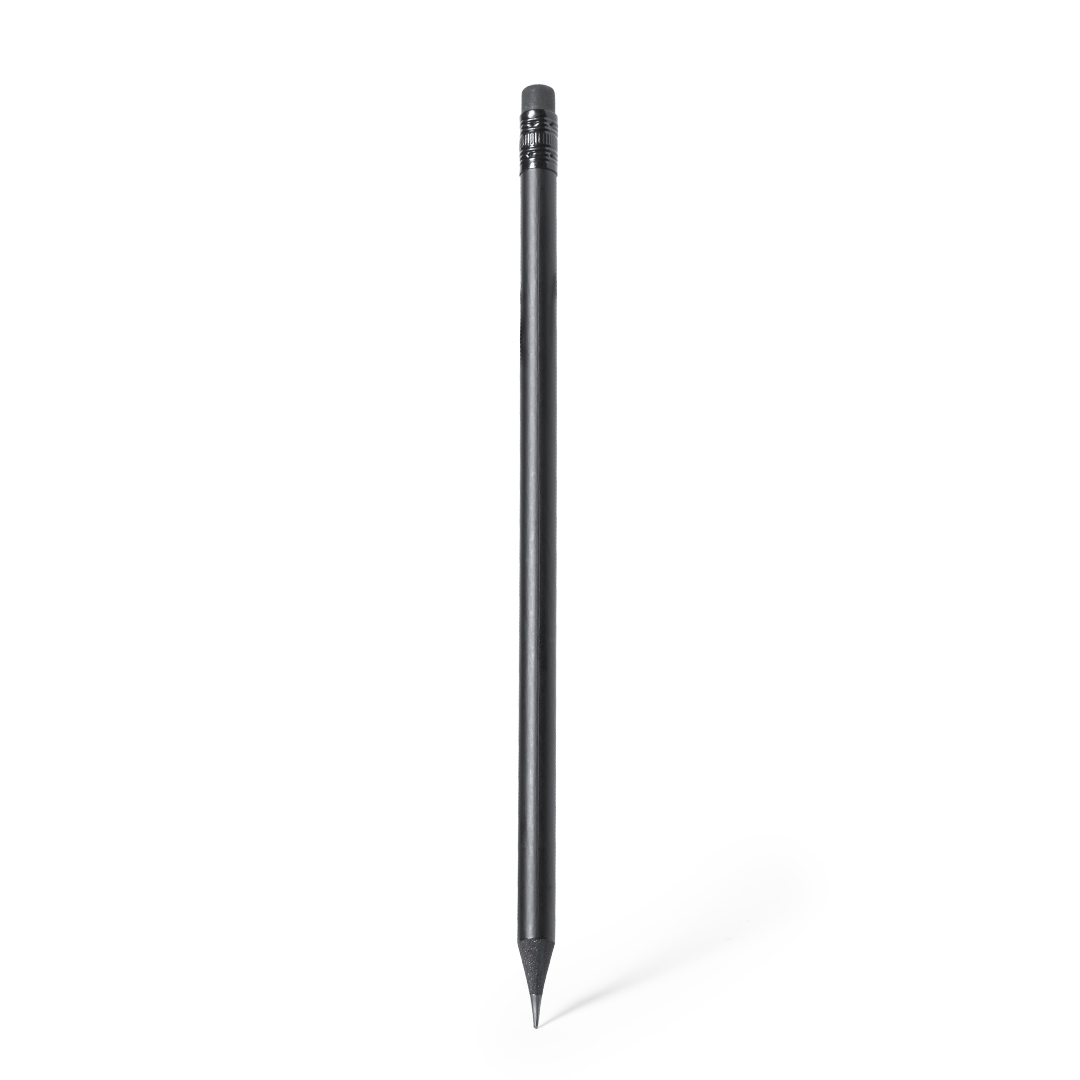 Creion din lemn natural cu finisaj mat negru. Cu radieră, mina neagră și vârf ascuțit.