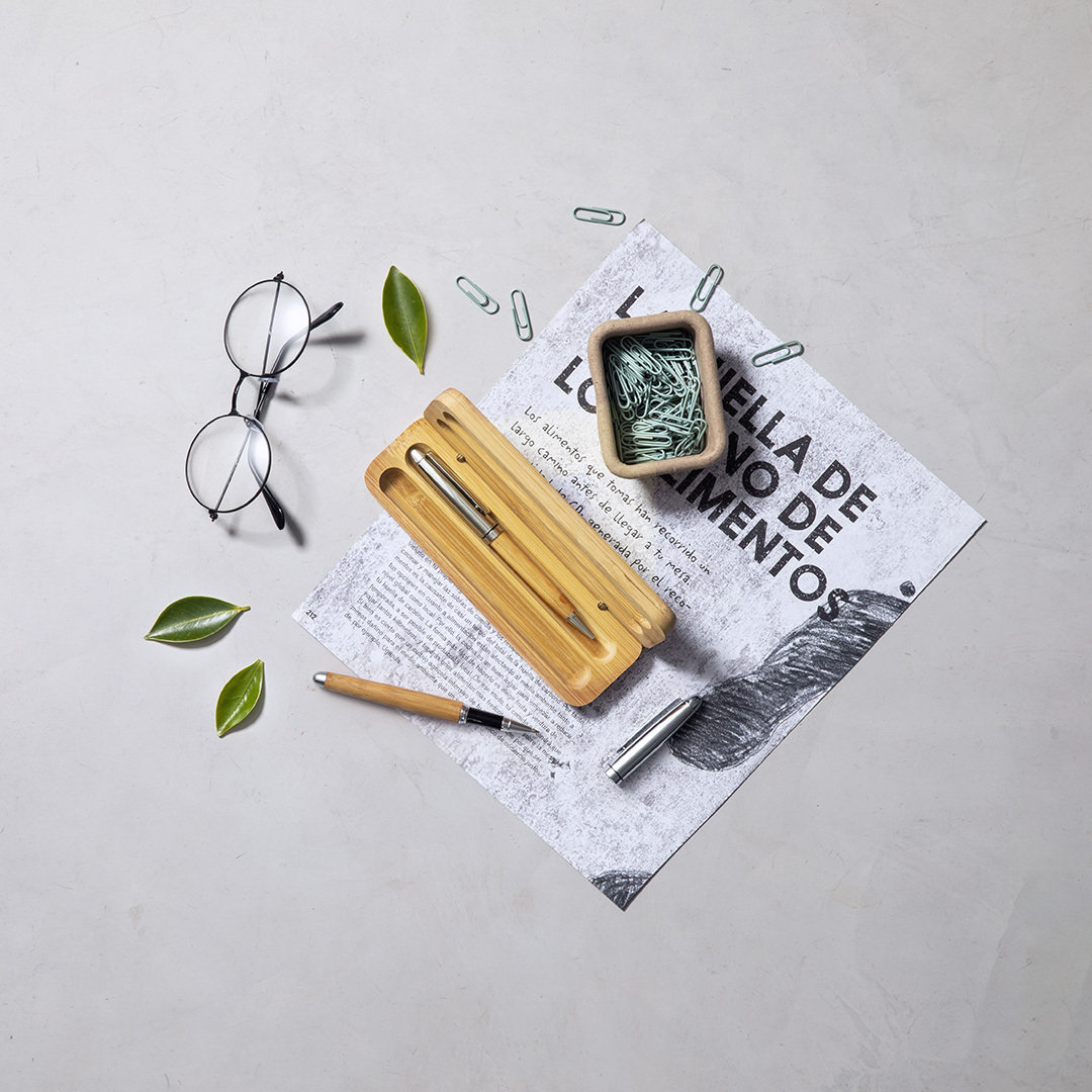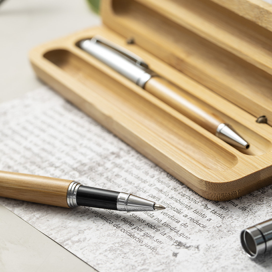 Set de pix cu bilă și roller Nature line. Fabricat dintr-o combinație de bambus și metal pentru a promova utilizarea materialelor naturale și a reduce emisiile de poluanți. Pix cu bilă cu mecanism de răsucire, cerneală albastră. Roller cu capac, cerneală gel albastră și reîncărcare jumbo. Prezentat într-un caz individual din bambus.