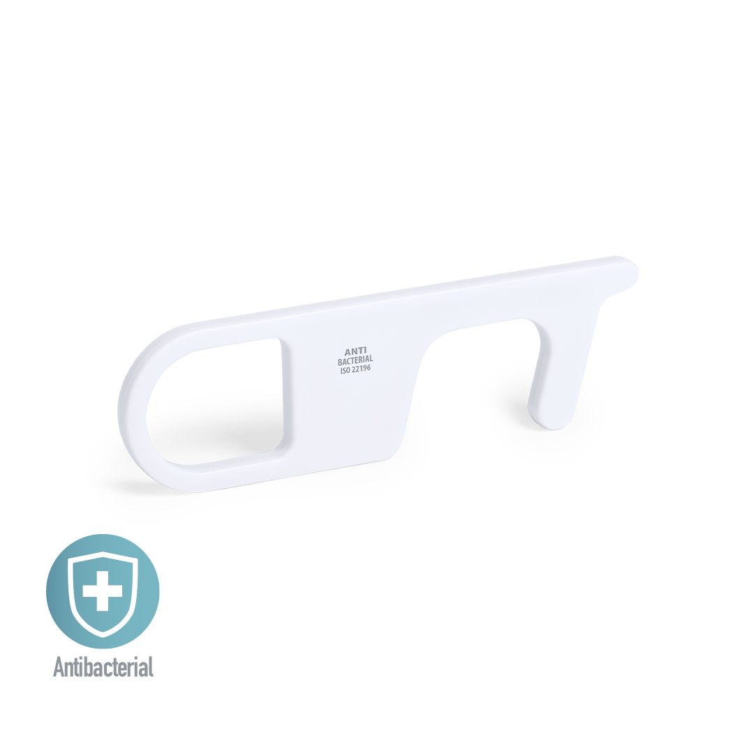Cheie de siguranță igienică, antibacteriană și anti-contact, realizată din ABS rezistent cu un finisaj solid. Proiectată special pentru a evita atingerea suprafețelor de utilizare publică cu mâinile (mânere de uși, întrerupătoare, robinete de uz public, bancomate…). Cu un decupaj confortabil pentru deget și prezentată într-un sac individual. Recomandată pentru imprimarea pad. Produsele cu tratamente antibacteriene sunt capabile să reducă drastic nivelurile bacteriene prezente pe suprafețele materialelor, datorită adăugării de agenți microbieni statici permanenți, cu o eficiență ridicată în inhibarea și prevenirea contaminării bacteriene. Articol conform standardului ISO 22196, care determină activitatea antibacteriană în materiale plastice și suprafețe neporoase. Acest lucru ne permite să cunoaștem eficiența inhibării microbiene pe care aditivii o au asupra obiectelor tratate printr-o evaluare cantitativă.