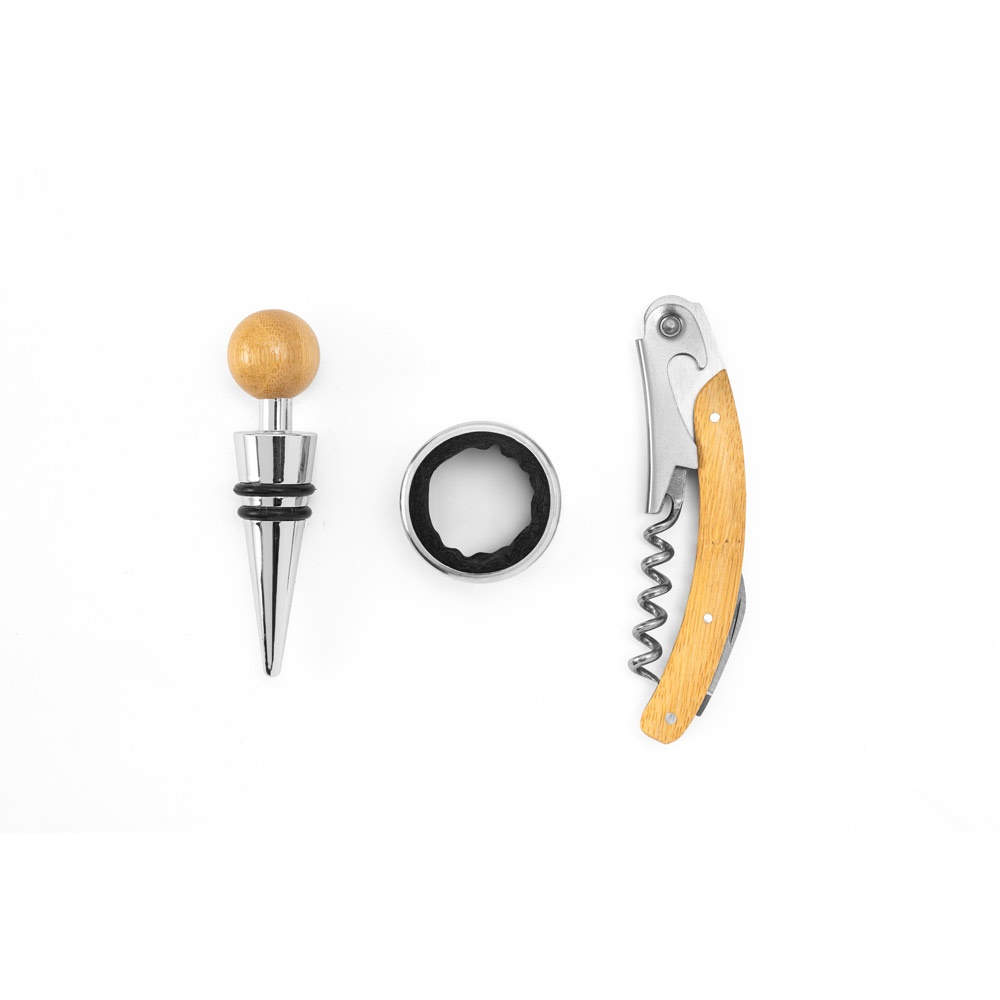 Set de vin din bambus și oțel inoxidabil. Include: 1 tirbușon, 1 dop și 1 inel metalic. Livrat într-o cutie cadou din hârtie kraft. Deoarece acest produs este fabricat din materiale naturale, culoarea și personalizarea produsului poate varia de la un produs la altul. 160 x 100 x 27 mm