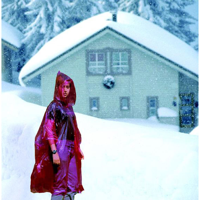 Poncho din plastic pliabil cu glugă atașată, ambalat într-un sac poliester transparent.