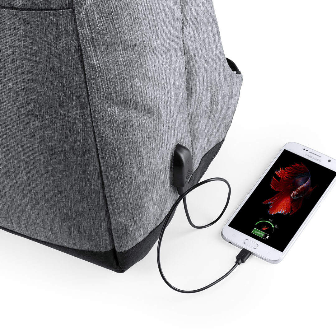 Rucsac anti-furt din poliester durabil 300D. Material de înaltă calitate, rezistent la tăieturi și zgârieturi, cu buzunar anti-furt pe spate pentru a stoca obiecte de valoare. Compartimentul principal cu fermoar este echipat cu conexiune pentru powerbank – nu este inclus – și două compartimente interioare separate, căptușite, pentru laptopuri de până la 15″ și tablete de până la 10″, plus buzunare suplimentare în interior. Dispune de un buzunar exterior frontal cu închidere cu fermoar. Confortabil de purtat datorită spatelui căptușit și bretelelor ergonomice, ajustabile. Cu accesoriu pentru montare pe trolley.