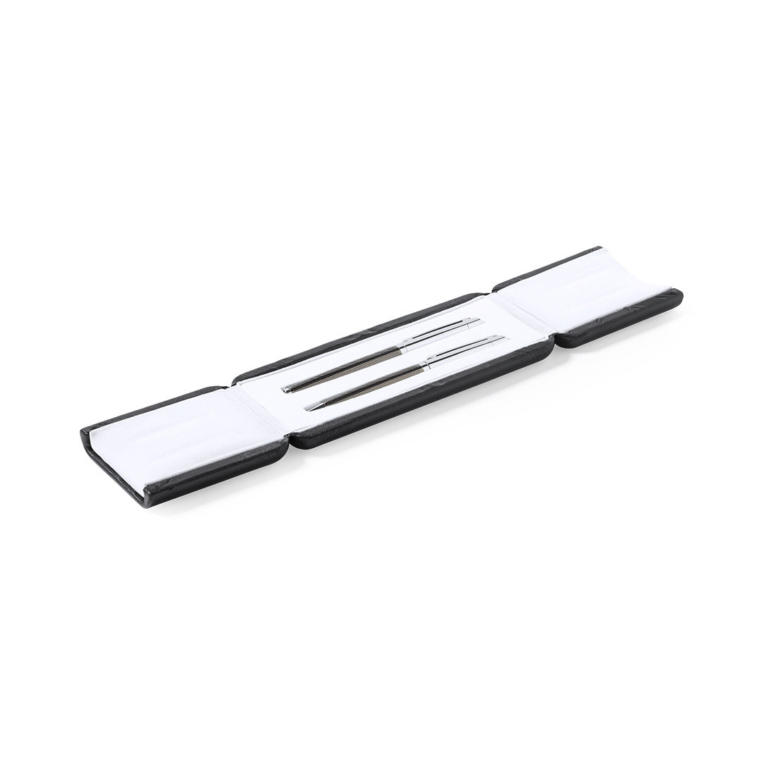 Set premium de pix și roller. Fabricat dintr-o combinație elegantă de metal în tonuri de negru și crom. Pix cu mecanism de răsucire, cu cerneală albastră și cartuș jumbo. Roller cu capac și cerneală gel albastră, cartuș jumbo. Prezentat într-o cutie individuală din PU cu interior din suede contrastant în alb.