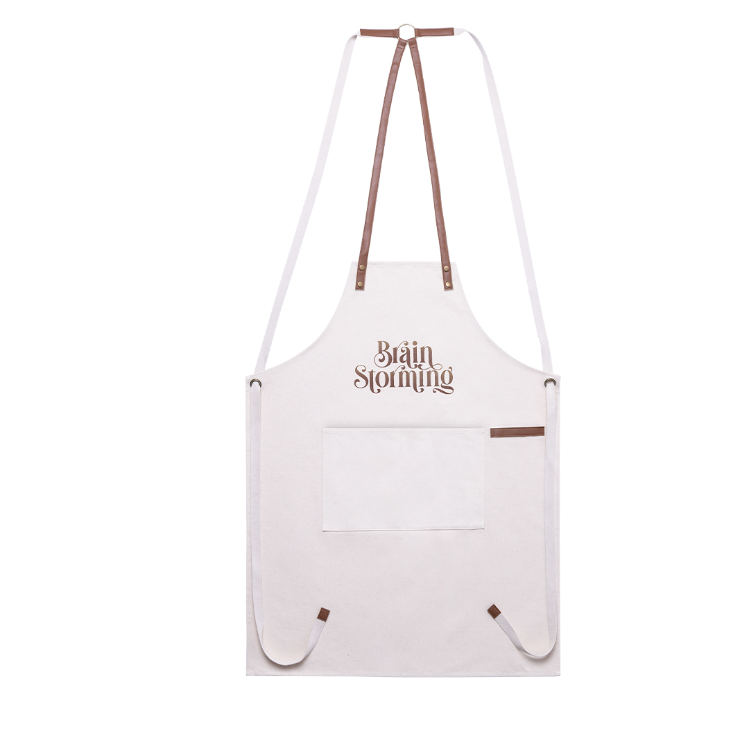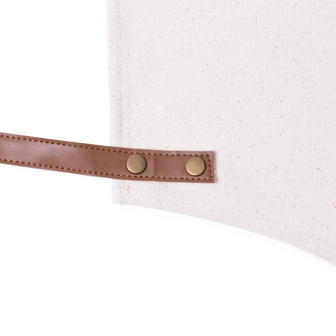 Șorț de înaltă calitate din material de bumbac canvas rezistent, 340g/m2, cu cusături întărite. Tăiat sub genunchi, cu curele rezistente din piele PU și ajustare triplă: gât, spate și talie. Cu buzunar frontal, accesoriu din piele PU și nituri metalice pentru întărire.