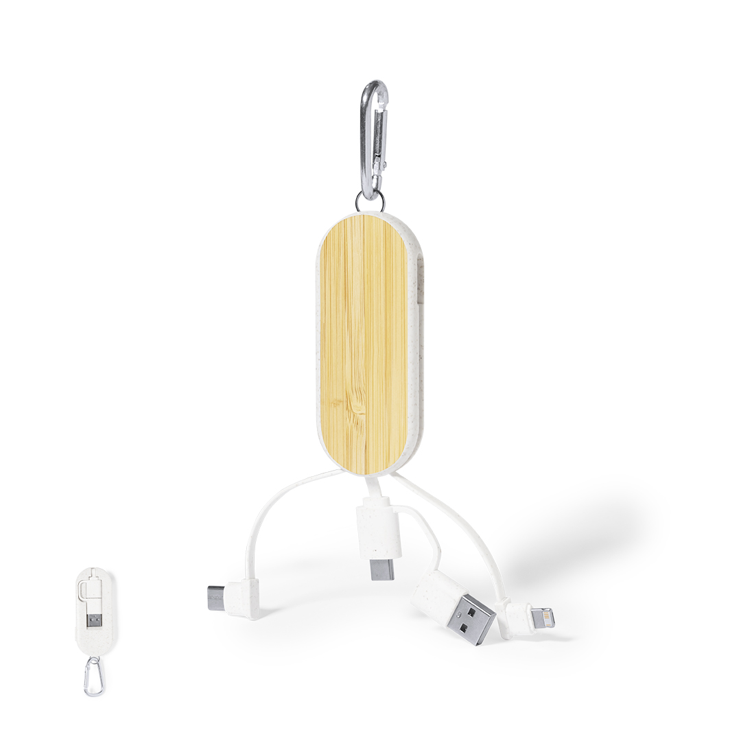 Cablu de încărcare cu carabină, fabricat din paie de grâu și bambus. Cu conexiuni de intrare Type-C și USB și ieșiri Type-C, Lightning și Micro USB. 5V DC 2A. Prezentat într-un sac de design kraft individual. Fabricat cu elemente vegetale pentru a promova utilizarea materiilor prime naturale și a reduce emisiile de poluanți.