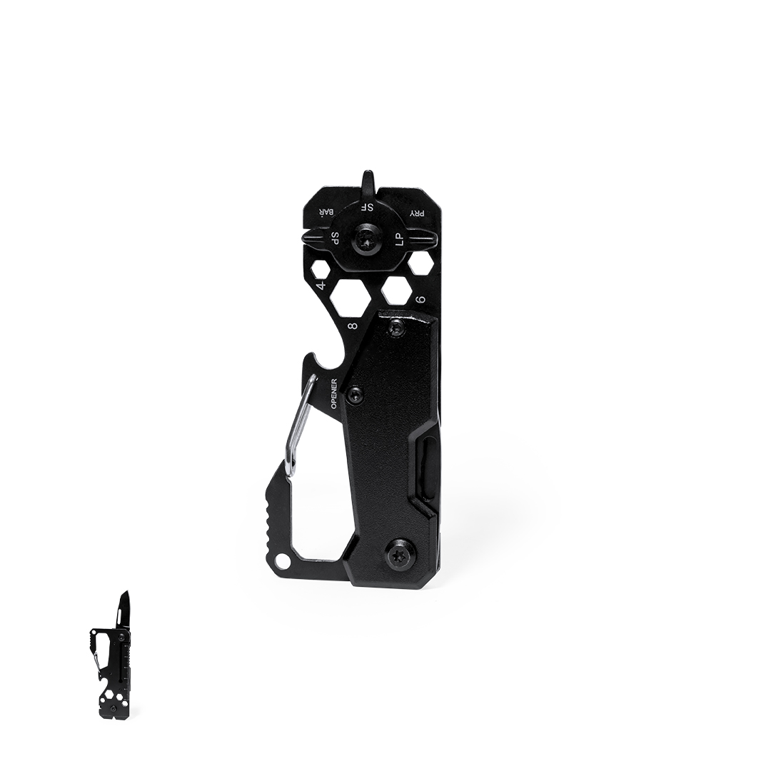 Superb unelte multifuncționale realizată din aluminiu și oțel inoxidabil cu finisaj negru. Cu 13 funcții diferite: cheie pentru piulițe hexagonale de diverse dimensiuni, carabină, deschizător de conserve, riglă, racletă, cuțit, șurubelnițe plate și Phillips. Prezentată într-o cutie cu design kraft.