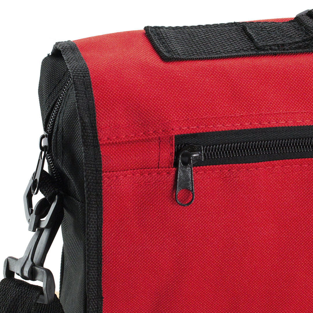 Geantă pentru documente din poliester 600D, cu clapetă cu velcro și bandă frontală elegantă de culoare neagră. Cu mânere de transport întărite și curea de umăr ajustabilă. În interior, buzunare pentru pixuri și husă pentru smartphone din PVC cu funcție tactilă.