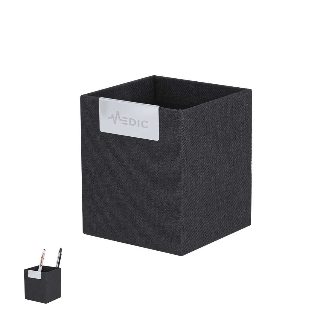 Suport pentru pixuri fabricat din RPET 300D bitone, cu detalii metalice strălucitoare. Include eticheta RPET. Materialul RPET este fabricat din plastic reciclat pentru a promova reutilizarea deșeurilor de plastic și a ajuta la sustenabilitatea planetei.